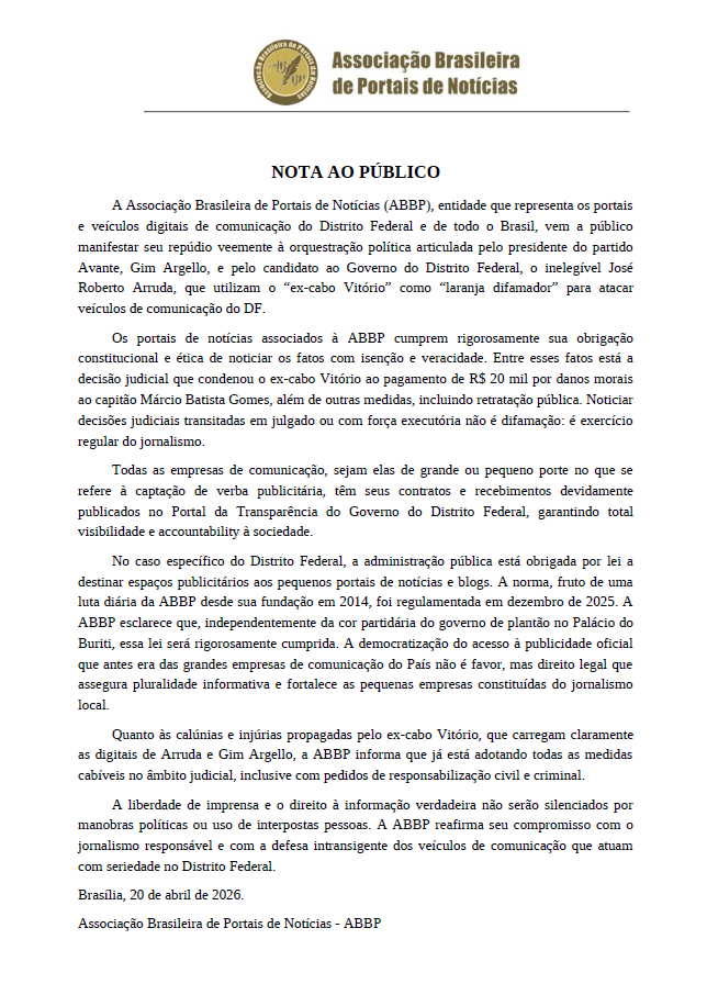 No texto, a entidade afirma que os portais têm sido alvo de ações difamatórias e atribui os ataques a uma articulação política. Segundo a ABBP, as acusações estariam sendo disseminadas por terceiros com o objetivo de atingir a credibilidade dos veículos.
